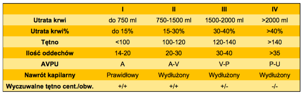 Tabela: Na podstawie tabeli klasyfikacji krwotoków ATLS (Advanced Trauma Life Support – American College of Surgeons