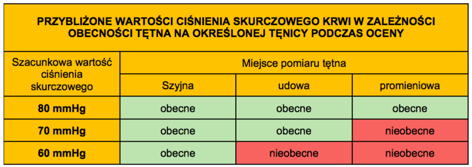 Jeżeli u poszkodowanego tętno nie jest wyczuwalne na tętnicy promieniowej, to ciśnienie skurczowe u tego poszkodowanego wynosi prawdopodobnie poniżej 90/80 mmHg. Tutaj pomocna może okazać się tabela przybliżonych wartości ciśnienia skurczowego krwi w zależności od obecności tętna na określonej tętnicy.